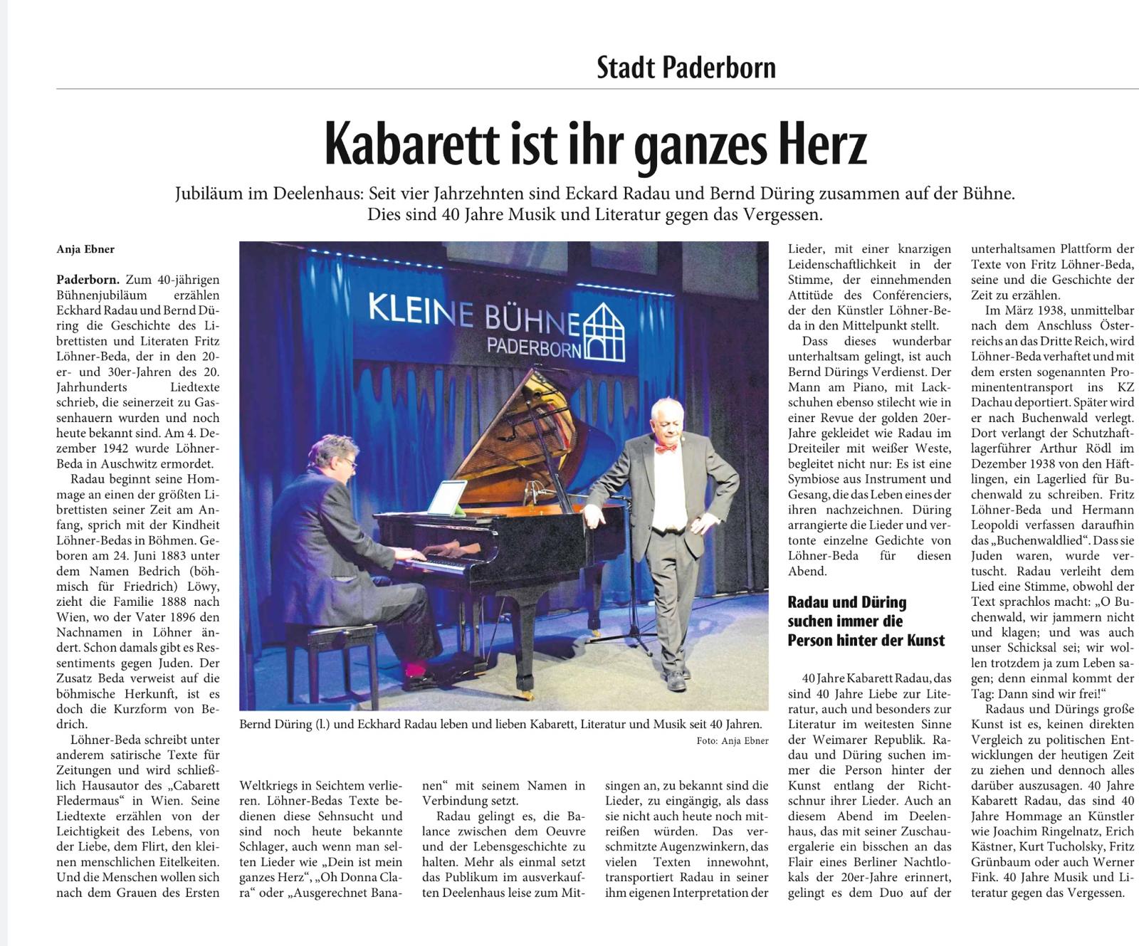 „…Bei Eckhard Radau gingen an diesem Abend Spottlieder, Satire-Gedichte und historische Erzählung Hand in Hand. Ein erfahrener Kabarettist, der mit der Materie ganz und gar vertraut wirkte, sich in den „Sound“ derDreißiger gut einfühlte, ohne ihn direkt kopieren zu wollen. Und Bernd Düring, der Mann am Klavier, tat das Seine. Mal mit einem Mini-Akkordeon, mal mit einer Swing-Nummer von Django Reinhardt. Anfangs spürte man noch die düsteren Wolken dieser Zeit, die über den Nummern schwebten. Aber im Laufe des Abends wurden sie immer mehr von Lachern verdrängt – dafür waren die Nummern eben einfach zu gut. Wie sprach’s Werner Finck seinerzeit zum mitschreibenden Gestapo-Mann: „Kommen Sie mit? Oder muss ich mitkommen?…“