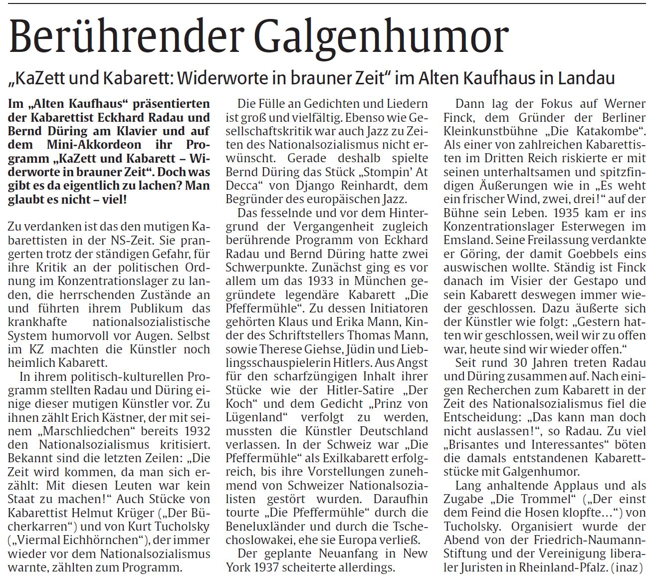 Am 13.11.2015 in Landau. Kritik „DIE RHEINPFALZ“ von Redakteurin Heike Klein
