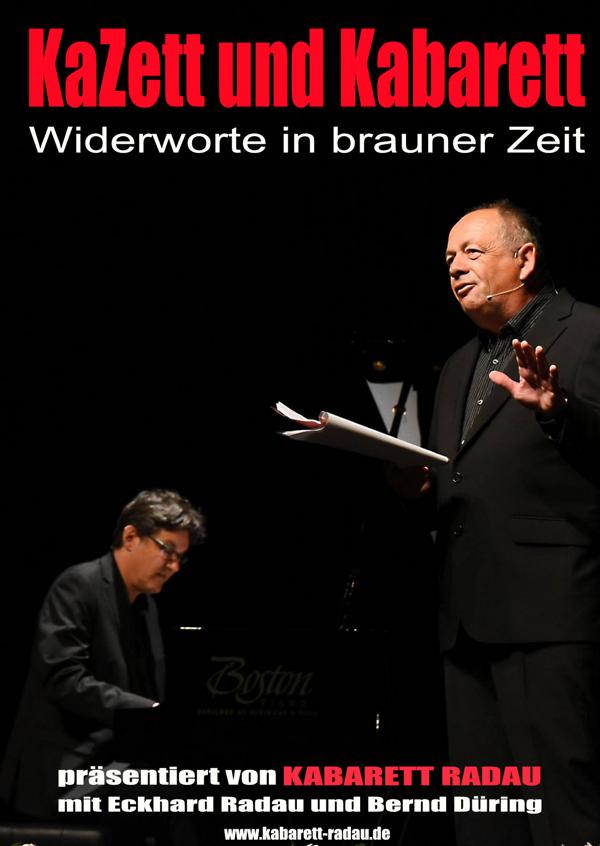 In „KaZett und Kabarett“ widmen sich Eckhard Radau und Bernd Düring den dreißiger Jahren des letzten Jahrhunderts. Der Faschismus hinterlässt auch in der Kabarett-Szene Deutschlands tiefe Wunden. Fast alle Kabaretts müssen aus politischen Gründen schließen. Aber in Berlin leistet „Die Katakombe“ unter ihrem Gründer Werner Finck spitzfindigen Widerstand, obwohl ständig die Internierung droht. Andere wiederum, wie zum Beispiel Erika Mann, gründen im benachbarten Ausland deutschsprachige Kabaretts, die die Verhältnisse in Deutschland auf die Schippe nehmen. Auch sie müssen vorsichtig vorgehen, sind ständig in Angst ausgewiesen zu werden.Deshalb wird in den Kabaretts nicht mit dem Holzhammer gearbeitet, sondern mit feinsten Nadelstichen. Eckhard Radau präsentiert als Conferencier und Sänger zusammen mit der von Bernd Düring dargebotenen und damals verbotenen Musik einen Querschnitt von widerspenstigen, durchaus das Leben gefährdenden Sticheleien gegen den braunen Zeitgeist.Seit 1983 arbeiten Bernd Düring und Eckhard Radau als Kabarett-Duo zusammen. Sie zählen somit zu den Urgesteinen der ostwestfälischen Kabarett – Szene. In dieser Zeit entstanden die Programme „Das Lächeln der Mona Lisa“, „Gesang zwischen den Stühlen“, „Vereinigt sein & rechts & Freizeit“, „Keine Sorge Volksentsorgung“, „Dem Volk auf’s Maul“, „Etwas schief in’s Leben gebaut“, „Schall & Rauch und Wilde Bühne“, „Paderborner Spitzen“…..
