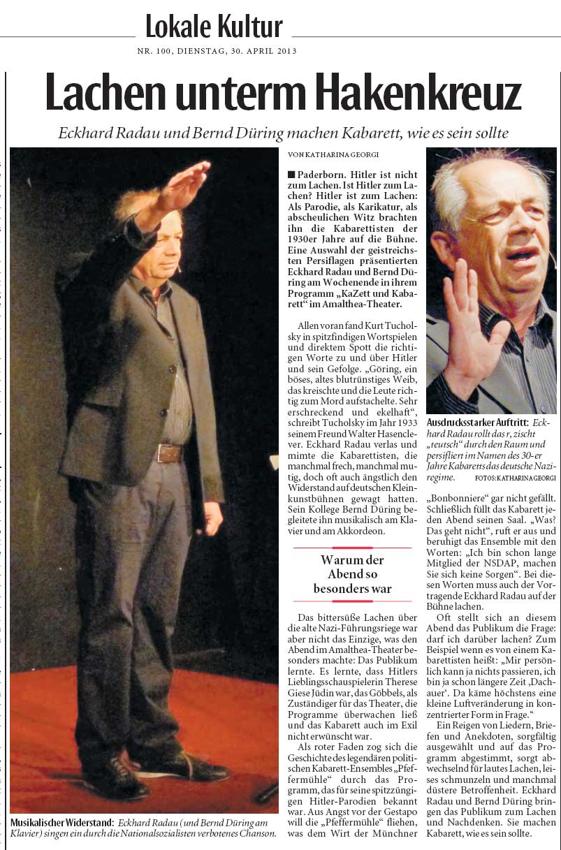 Das Landauer Publikum lässt sich von dem düsteren Humor mitreißen. Es lacht und singt mit. Kein Zweifel, das Duo aus Paderborn hat für sein Programm „KaZett und Kabarett: Widerworte in brauner Zeit“ gute, ausdrucksstarke Texte ausgewählt. …“