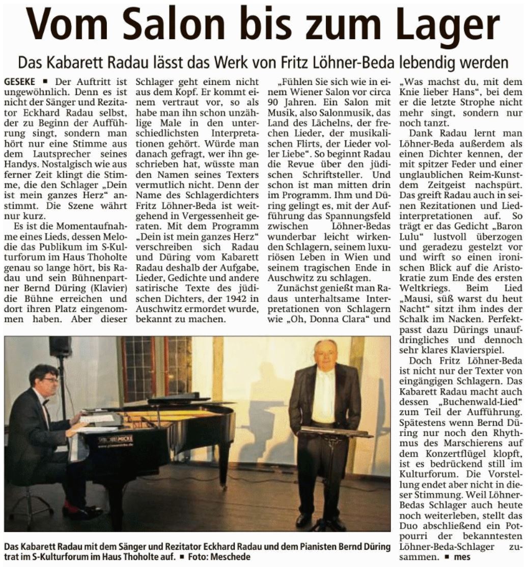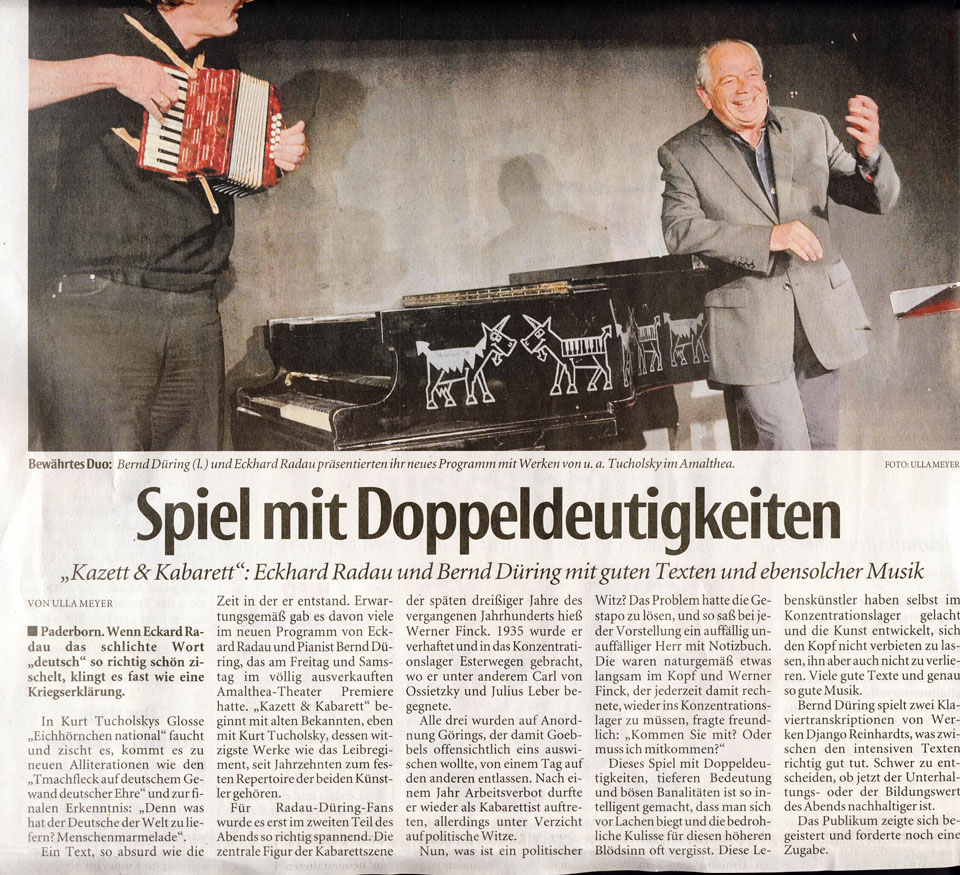 „Radaus Wortkunst als Conferencier und Dürings musikalische Begleitung am Klavier ließen den Abend zu einer feierlichen Hommage an die „anderen“ 30er und 40er Jahre werden. …