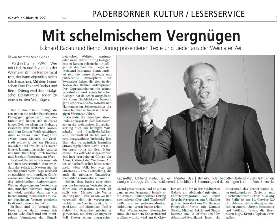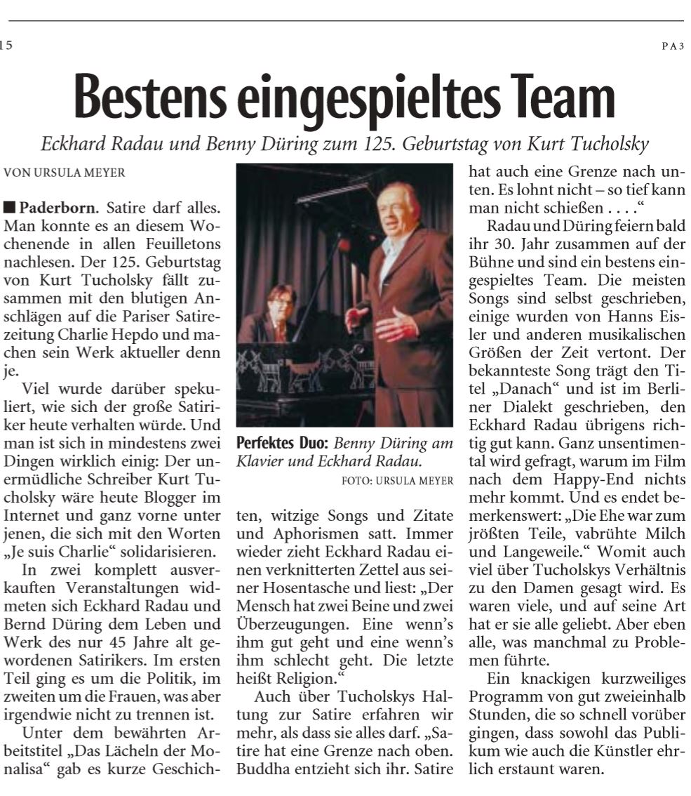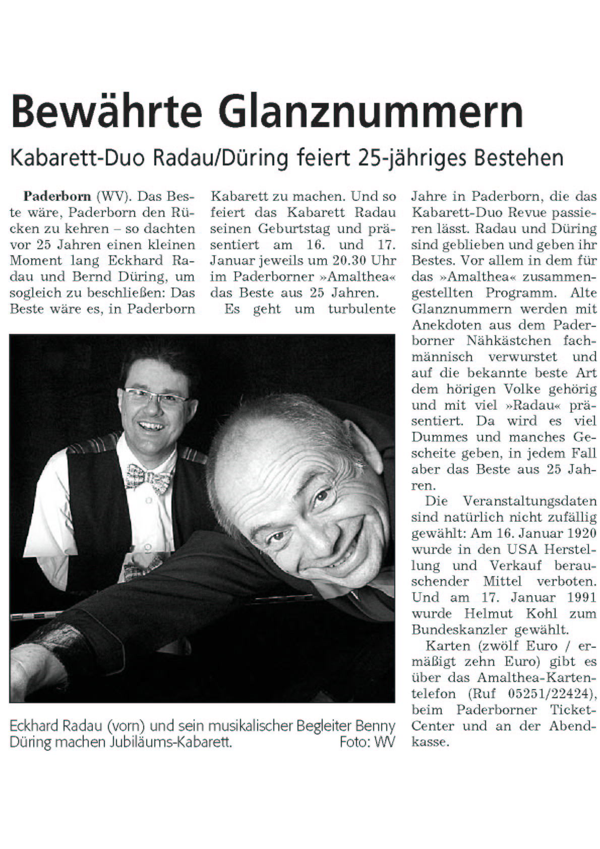 Das Publikum wusste an diesem Abend die gehobene Unterhaltung zu schätzen. Es zollte den beiden Akteuren Radau und Düring lang anhaltenden Applaus.“